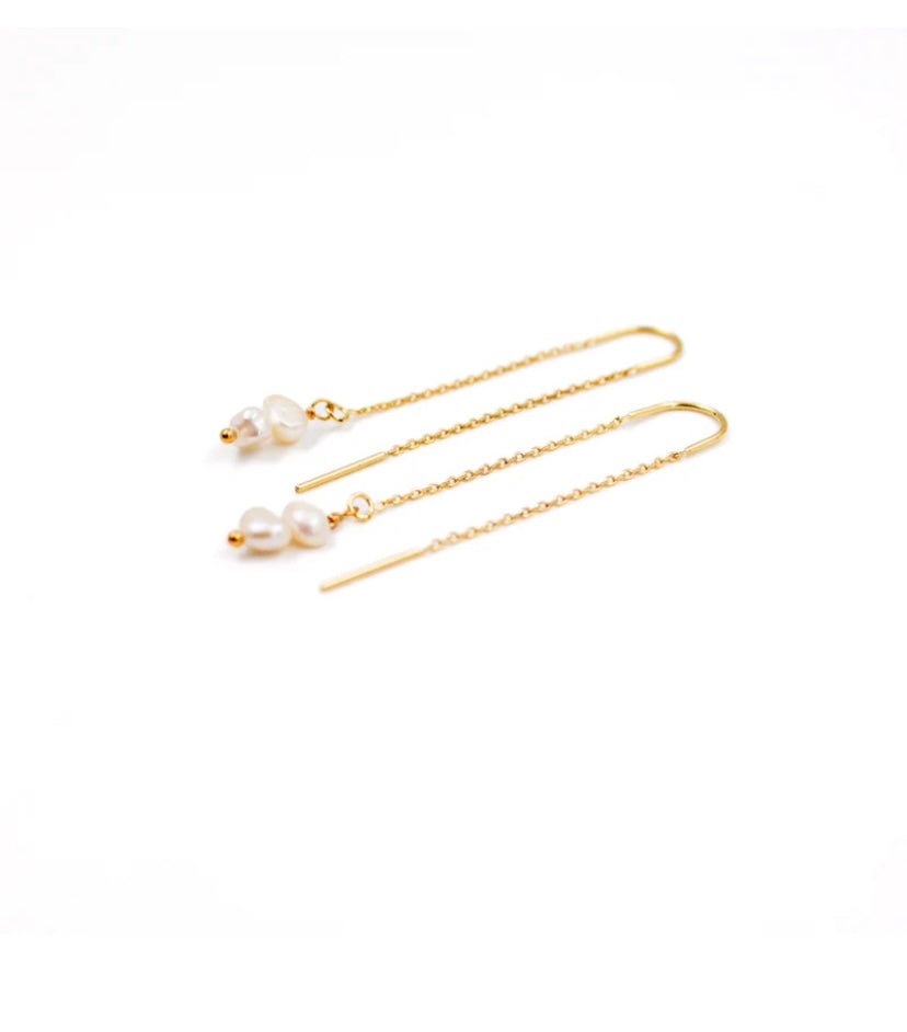 Boucles d'oreilles tiges coulissantes Eve L'Atelier des Dames en laiton doré à l'or fin, ornées de perles de nacre. Longueur : 5 cm.