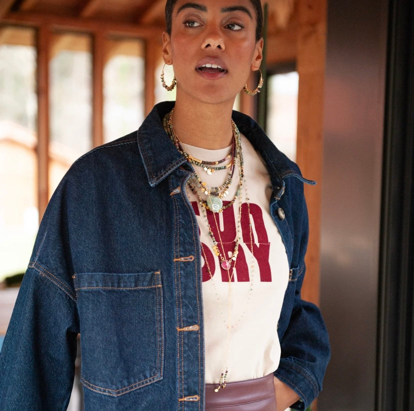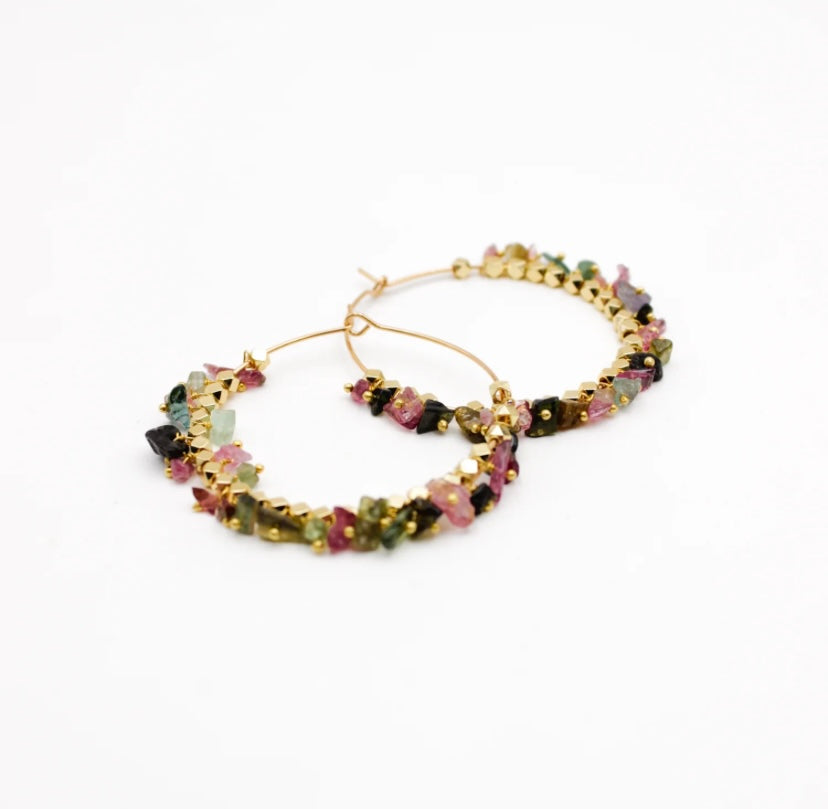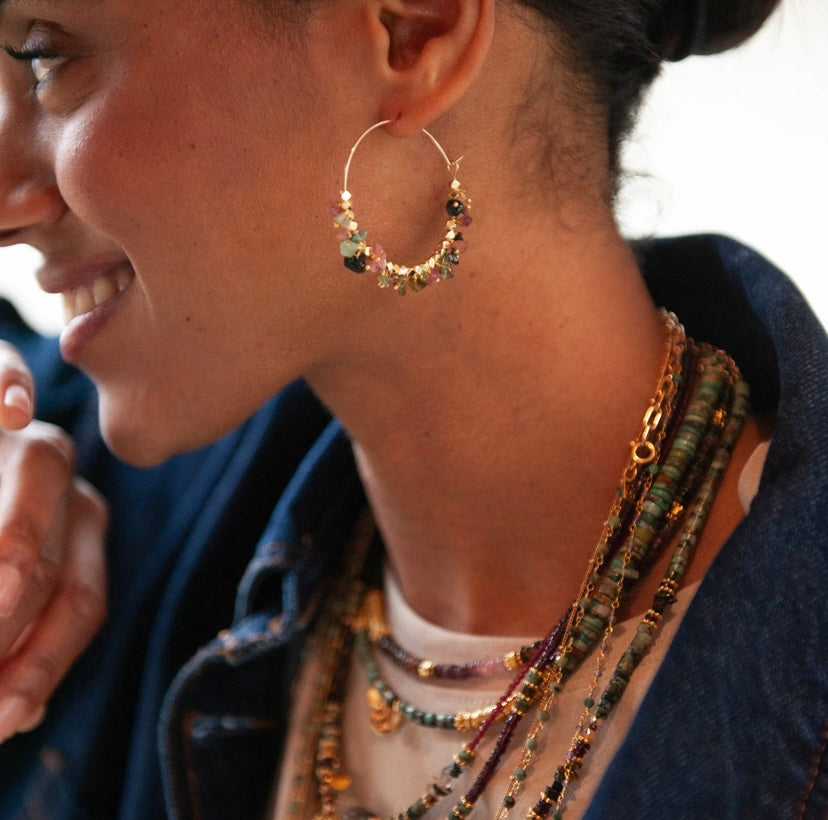 Créoles Charlotte L'Atelier des Dames en laiton doré à l'or fin, ornées de délicats grelots crunchs en pierres fines de tourmaline. Diamètre : 4 cm.
