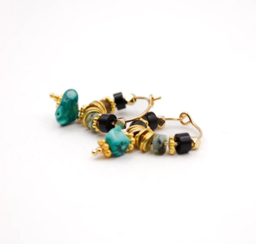 Mini créoles Alba L'Atelier des Dames en laiton doré à l'or fin ornées de pierres heishi d'onyx noir et de rondelles dorées, et d'une pampille en turquoise. Diamètre : 1,5 cm.
