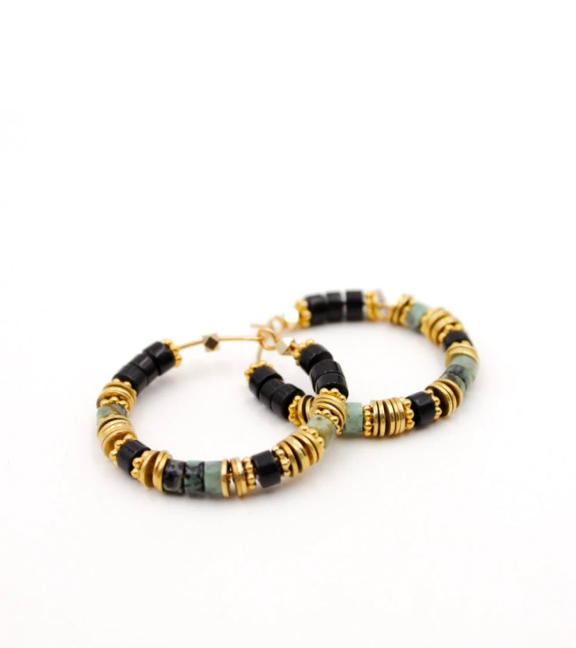 Créoles Alba L'Atelier des Dames en laiton doré à l'or fin orné de pierres heishi d'onyx noir, de turquoise et de rondelles dorées. Diamètre : 3 cm.