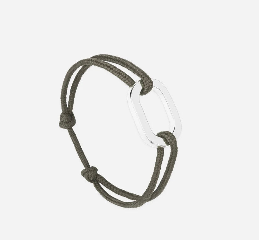 Bracelet Tige Le Vent A La Française orné d'un maillon hunier plat en plaqué argent 10 microns de 22 mm monté sur un cordon coulissant vert kaki. Confectionné à la main. Fabrication 100 % française. Unisexe. Résistant à l'eau.
