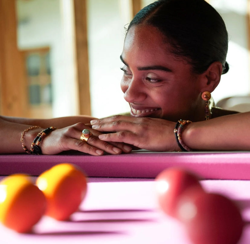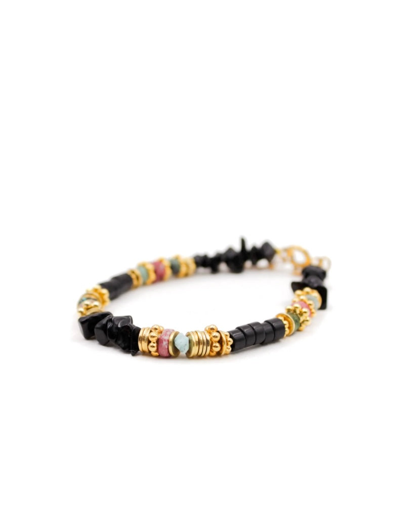 Bracelet Elsa L'Atelier des Dames en laiton doré à l'or fin, orné de pierres heishi crunchs d'onyx noir, rhodonite, turquoise et de rondelles dorées. Longueur : 16 à 18 cm.