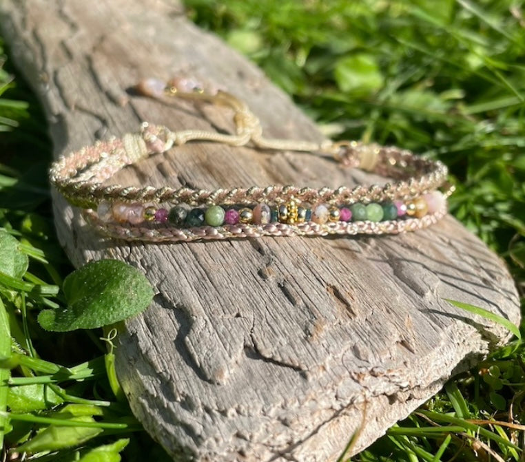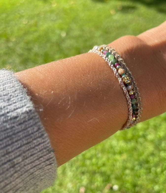 Manchette triple rangs Brady Clo & Lou composé d'un lien de pierres fines de crysocolle, de pierre de lune, de grenat et de perles en argent 925 plaquées or jaune, agrémenté d'un cordon en fils de soie tressé et d'un ruban de passementerie. Ajustable grâce à ses cordons coulissants.