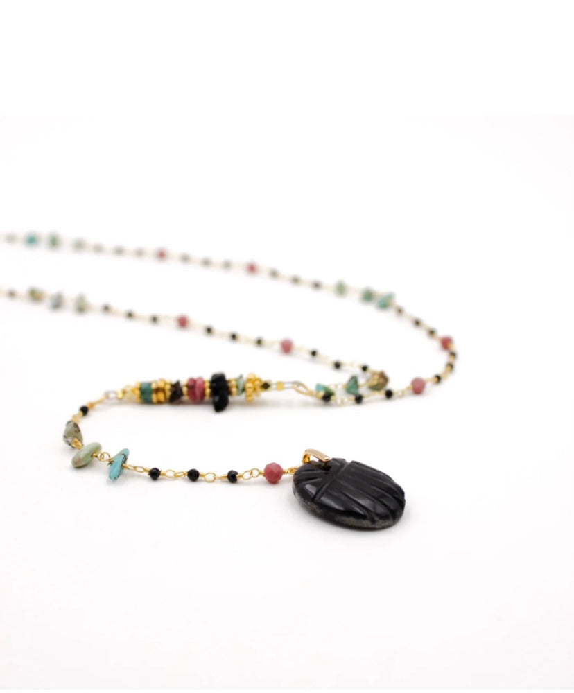 Collier chapelet Elsa L'Atelier des Dames en laiton doré à l'or fin, orné de pierres d'onyx noir, rhodonite, turquoise et d'un pendentif scarabée en onyx noir. Longueur : 60 à 65 cm.