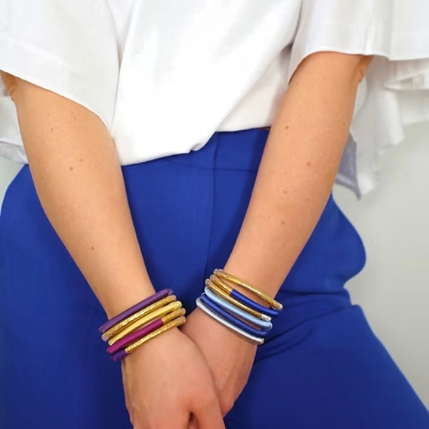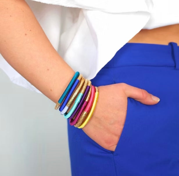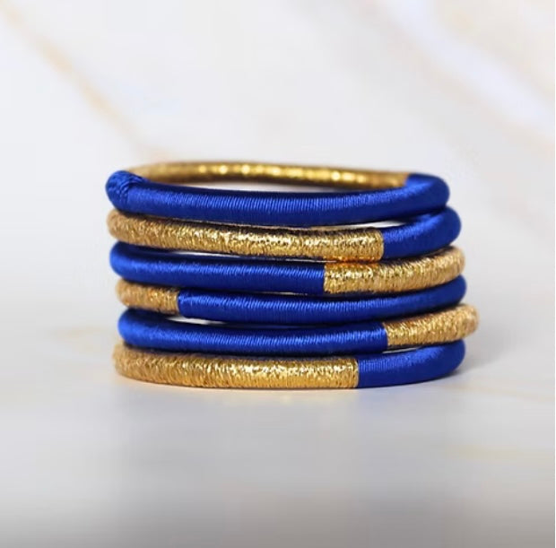 Jonc Dahabi de Maison Izel réalisé en fil de soie végétale, extraite de l'aloe vera de couleur dorée et bleu majorelle et tissé avec soin, selon les méthodes ancestrales de la passementerie marocaine, autour d'un jonc en caoutchouc.