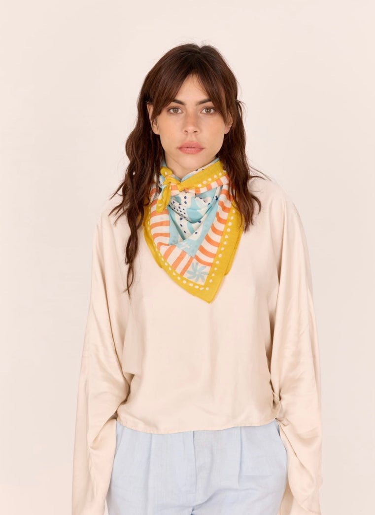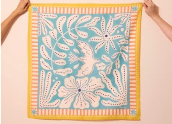 Foulard Liberté de la marque Maradji 100 % voile de coton avec son motif colombe et ses nuances de bleu ciel, ocre jaune et orangé. Dimensions : 80 x 80 cm.