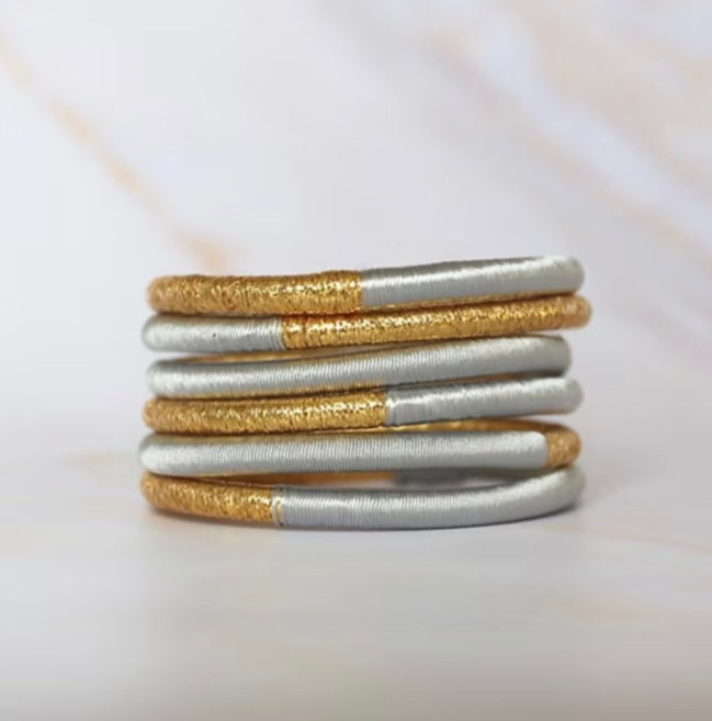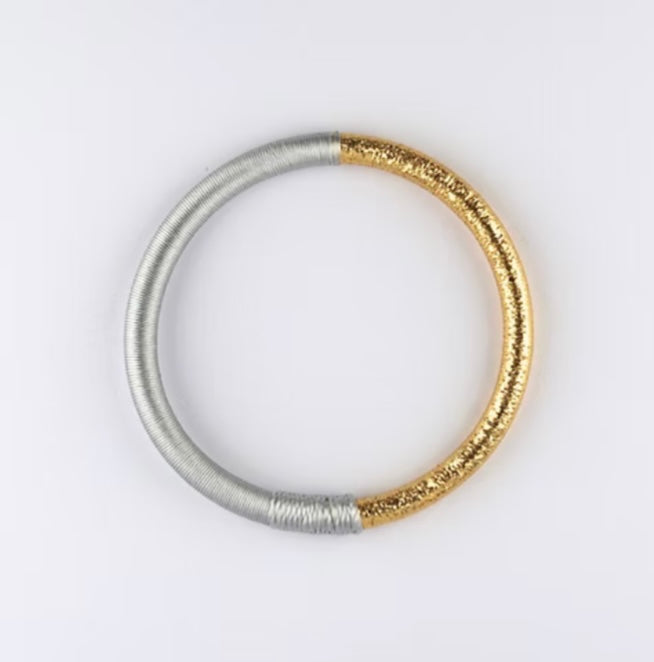 Jonc Dahabi de Maison Izel réalisé en fil de soie végétale, extraite de l'aloe vera de couleur dorée et gris clair et tissé avec soin, selon les méthodes ancestrales de la passementerie marocaine, autour d'un jonc en caoutchouc.